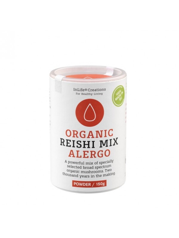 The medicinal mushrooms contained in the Organic Reishi Mix Allergo blend include: Agaricus blazei (Murill), Hericium erinaceus (Lion's Mane), Grifola frondosa (Maitake) and Ganoderma Lucidum (Reishi) which have been shown in clinical studies effective irrespective of whether they were ingested before the alergy occurred at all or when it was already present, as the mixture of mushrooms in any case prevented or reduced the occurrence of allergic reactions.